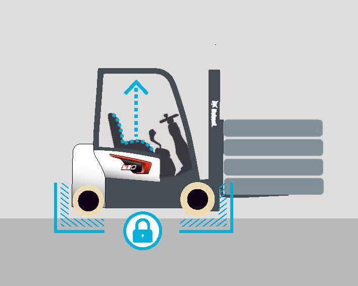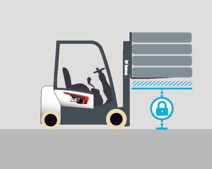 När operatören lämnar trucken obevakad förhindrar det hydrauliska låssystemet oavsiktlig sänkning och tilting av masten. Detta håller trucken, lasten och arbetsområdet säkra.