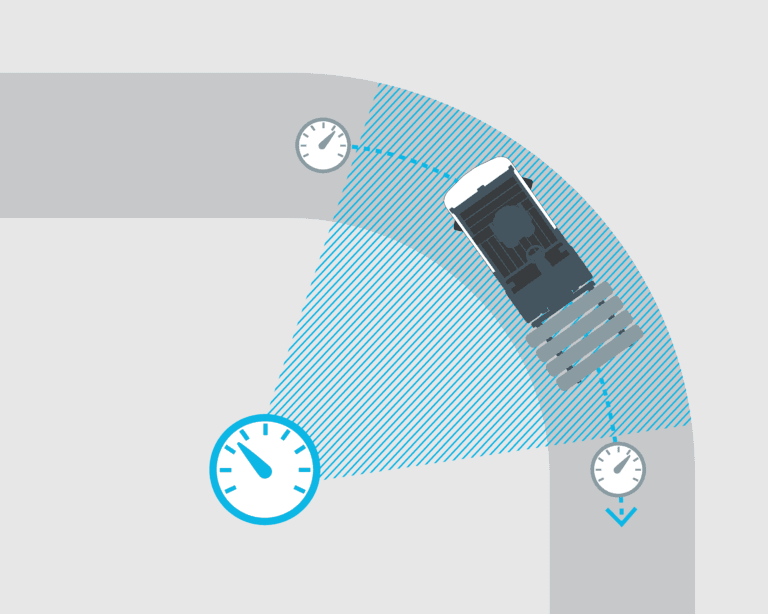 Vid skarpa svängar saktar trucken automatiskt ned för att minska risken för olyckor och skador.