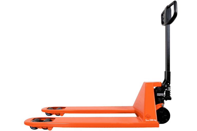 Pallyftare från Toyota/BT med boggihjul i polyuretan. Även utrustad med Quicklift. 1150 mm långa gafflar.