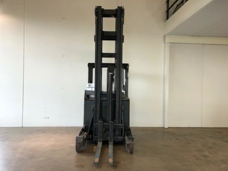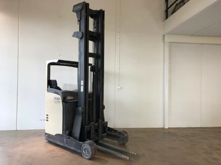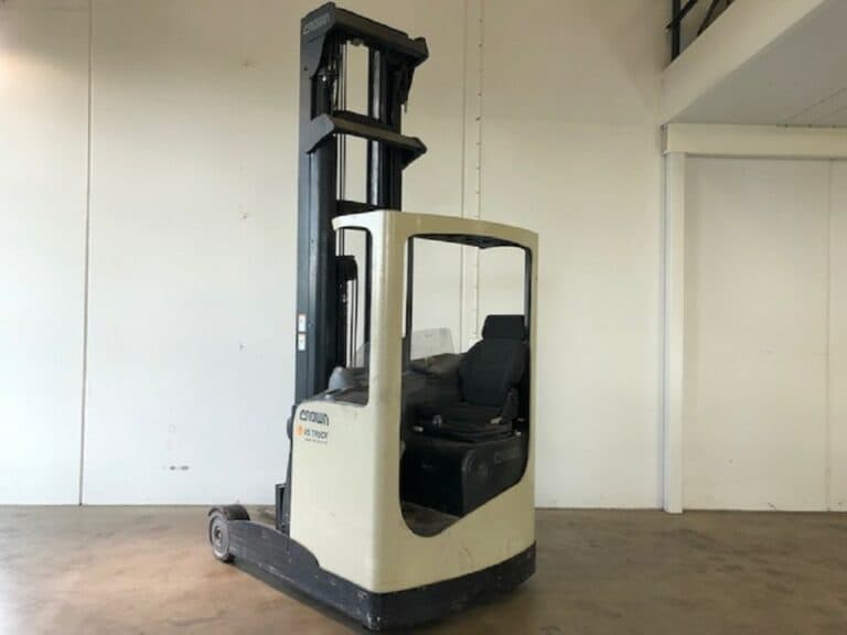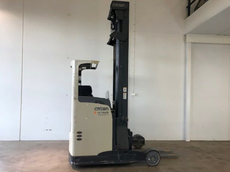 Skjutstativtruck från Crown med sidoföring. Trucken har en rejäl lyfthöjd om över 8,8 m.