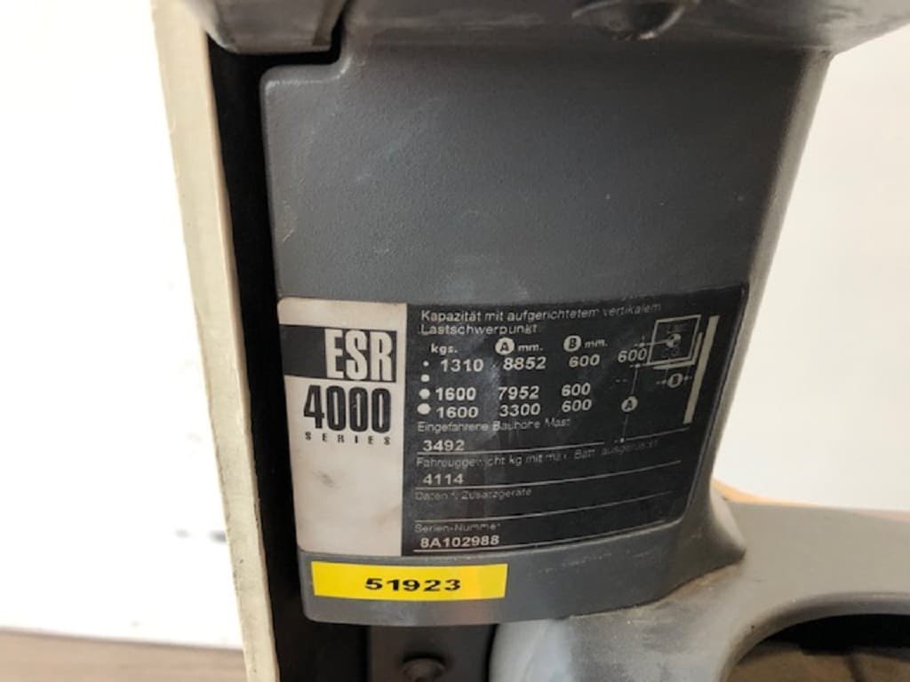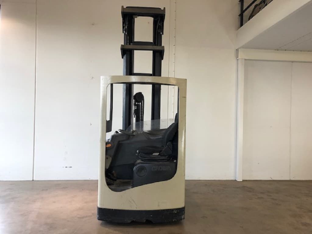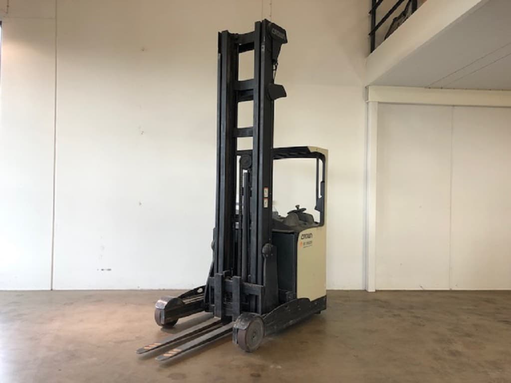 Skjutstativtruck från Crown med sidoföring. Trucken har en rejäl lyfthöjd om över 8,8 m.