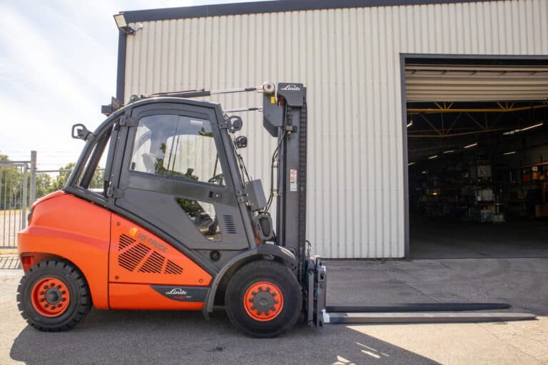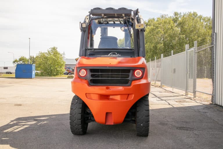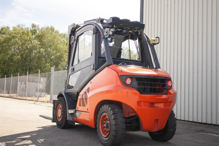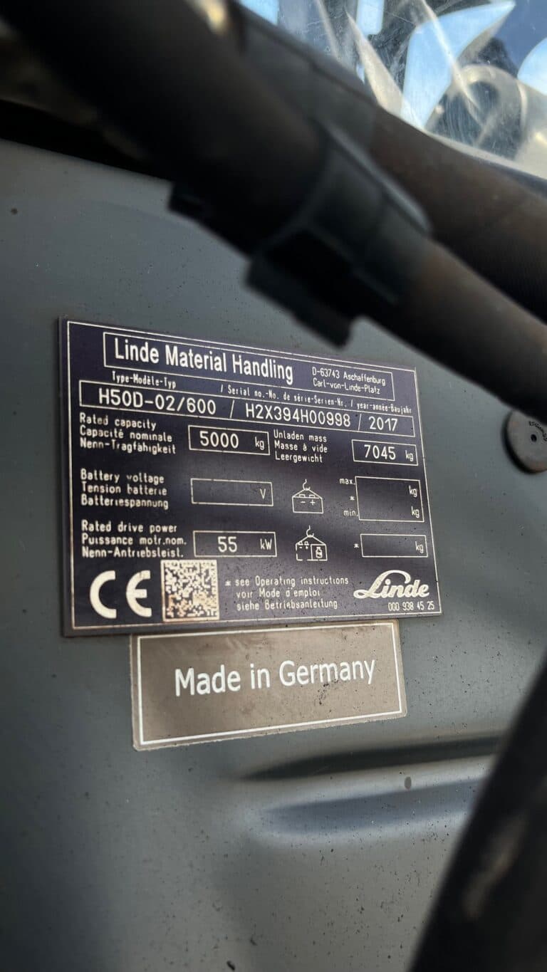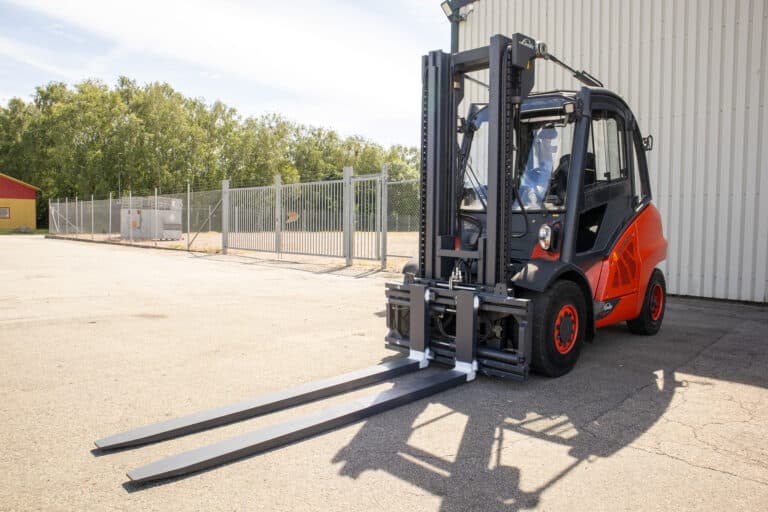Välutrustad 5-tons dieseldriven motviktstruck från Linde med hytt och hyttvärmare. Aggregat med sidoföring och gaffelspridning, 2400 mm långa gafflar. God sikt! Nya bakdäck. Vägtrafikbelysning. Dubbla arbetsbelysningar fram och bak. Vindrutetorkare fram, bak och på tak. Grammer luftstol.