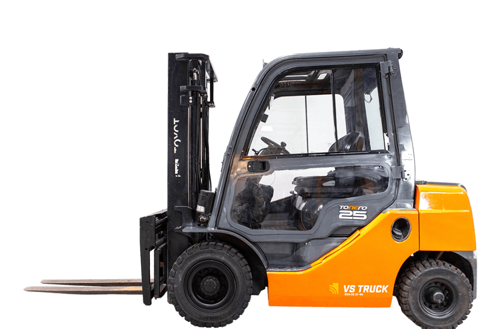 Lågbyggd 2,5-tons dieseldriven motviktstruck med sidoföring och gaffelspridning från Toyota. Hyttvärmare. VTF-belysning bak samt takmonterat blixtljus, arbetsbelysning bak. Panoramaspegel
