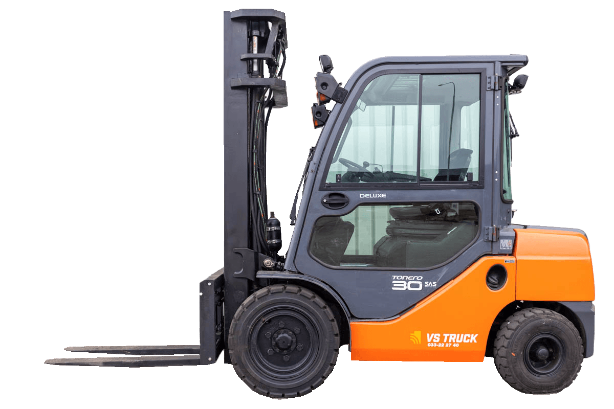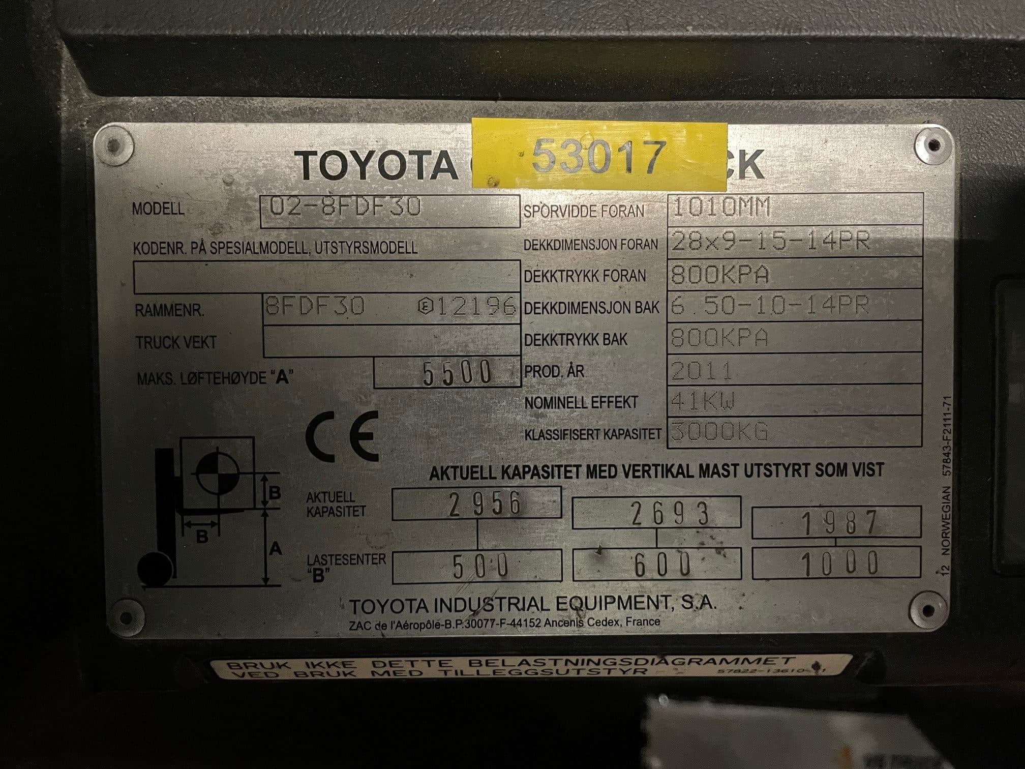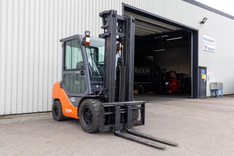 3-tons dieseldriven motviktstruck från Toyota med rejäl lyfthöjd om 5500 mm. Nya gafflar! Hytt och hyttvärmare. Däck runtom i gott skick. Aggregat med sidoföring och gaffelspridning som manövreras med minispakar. Pedalstyrd. Välutrustad med bla SAS-system, VTF-belysning, extra arbetsbelysning fram & bak, brandsläckare