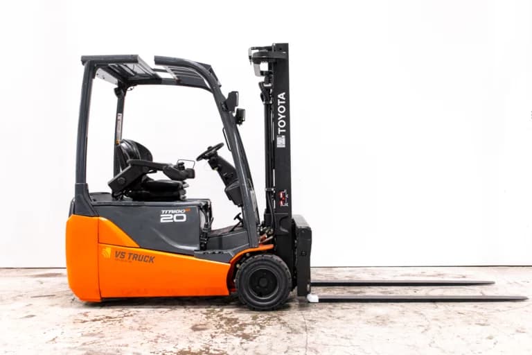 Containergående 3-hjulig 2-tons eldriven motviktstruck från Toyota. Nytt batteri! Aggregat med sidoföring och gaffelspridning, manövreras med minispakar, 1800 mm långa gafflar.