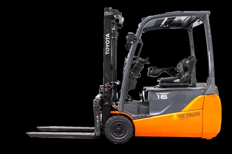 Containergående 1,6-tons eldriven motviktstruck från Toyota med utskjutsgafflar (1150-1900 mm) och vågindikator (ej krönt). Aggregat med sidoföring och gaffelspridning. Batteri från 2019. SAS-system. Tak samt framruta med vindrutetorkare. Arbetsbelysning fram (LED), 2 st. VTF-belysning bak. Panoramaspegel.