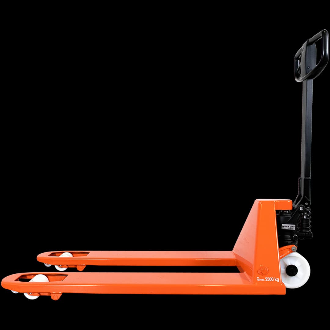 Vi har pallyftare för alla tillfällen, från enkla modeller för en billig peng till avancerade modeller med quicklift och ergonomiskt handtag. Våra handtruckar från Pramac, Bobcat och BT ger er flexibilitet när det gäller maxvikt och gaffellängd. Gafflarna kan ha en bredd från 150 till 225 mm och längder upp till 2 500 mm. De två absolut vanligaste hjuluppsättningarna som finns till en pallyftare, handtruck eller palldragare är singel och boogie, och de finns i olika material som polyuretan och nylon. Polyuretan är perfekt för dig som vill ha en tyst truck. För dig som hanterar många pallar är en elektrisk pallyftare ofta ett smartare val.